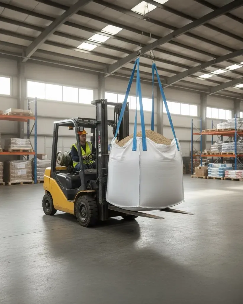A distinctive feature of this type of packaging is its round construction, eliminating the presence of side seams. This design minimizes the risk of bag leakage, which could lead to damage or spillage of the stored cargo. The upper part of this type of container bag is finished with four convenient and ergonomic handles. Their distributed structure allows easy access for a forklift.